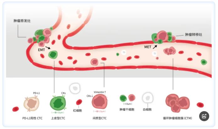 腫瘤細胞從腫瘤組織中脫落,在進入外周血循環的過程中發生上皮-間質轉變(EpithelialMesenchymal Transition,EMT),并克服自身及血液循環中各種因素的殺傷作用,到最后定植形成新的轉移灶等多個步驟,使得循環腫瘤細胞(CTC)可順利侵襲轉移從而促進相關疾病的進展。