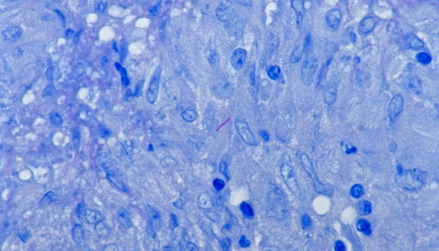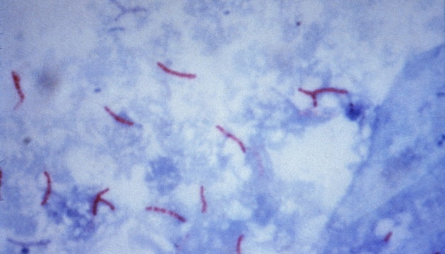 抗酸染色的結核桿菌,紅色為結核桿菌