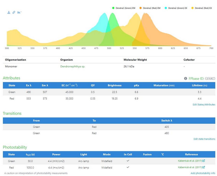 這種綠紅轉化的熒光蛋白來自珊瑚,因其轉化跟秋天的楓葉從綠變紅相似,故而得名Kaede(楓葉),但由于性質限制,Kaede并不是可靠易用的商用活細胞染色劑。在超分辨成像中常用的光轉化熒光蛋白主要有Dendra2、mEos2、和mKikGR三種。