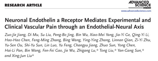 近日,南通大學藥學院劉興君教授團隊聯合國內多個院所在國際頂級期刊《Advanced Science》(影響因子14.3)發表重磅研究,首次揭示血管內皮細胞通過ET-1/ETAR信號通路調控血管痛的全新機制。