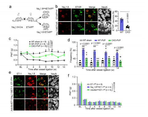 通過光遺傳學、化學遺傳學及轉基因技術,團隊發現血管內皮細胞來源的ET-1(內皮素-1)通過激活傷害性感覺神經元上的ETAR受體,形成“內皮-神經-脊髓”調控環路,驅動血管痛發生。這一發現為臨床治療提供了新靶點。
